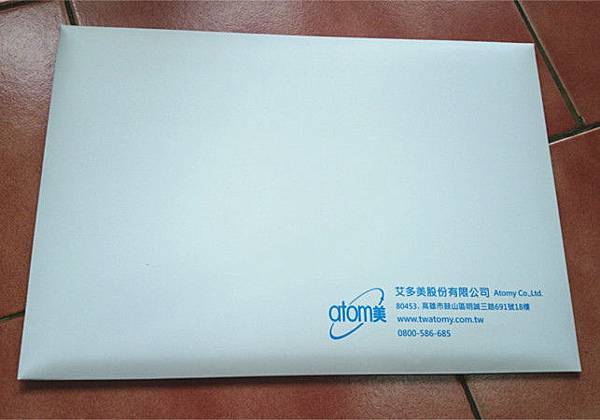 白色A4大小的信封,只以簡單的藍色字樣寫上公司資訊。