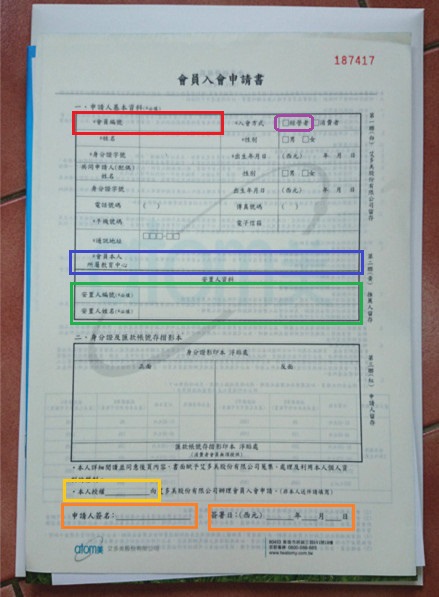 紅色框:為上網註冊時,最後給妳的會員編號。請自行寫上